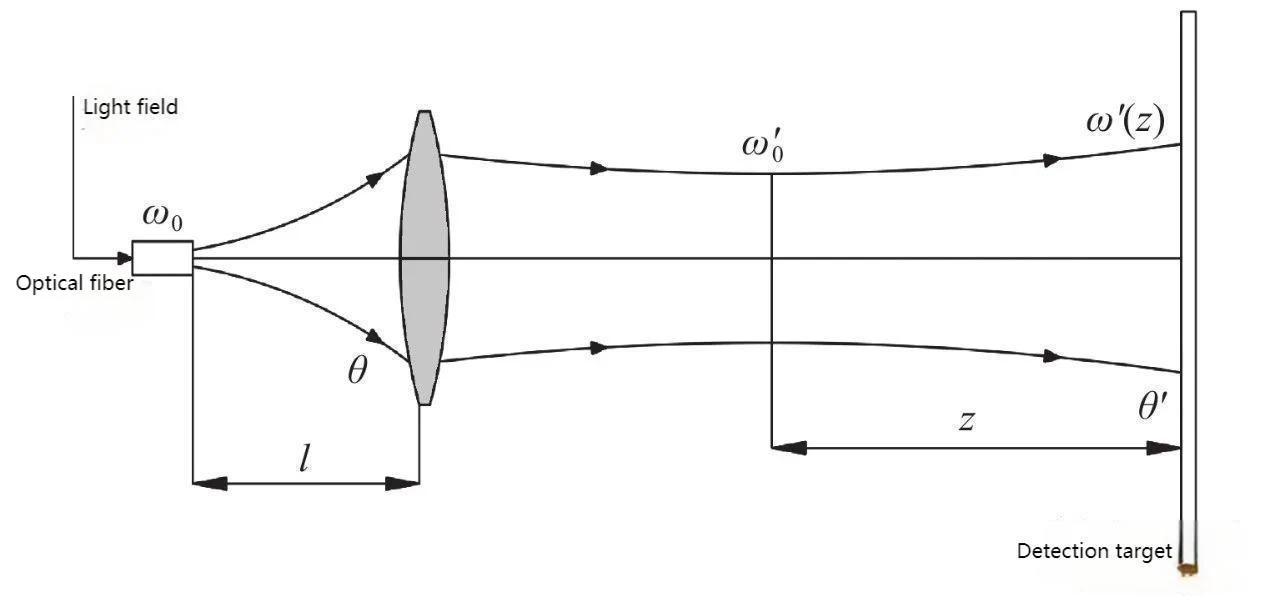 The schematic diagram of the collimation optical system is shown in Figure 2. The laser beam is emitted from the fiber end face, with an initial beam waist radius of ω0, a divergence angle of θ, and a distance l from the shaping lens. After being shaped by the lens, the beam still has the properties of a Gaussian beam. The beam waist radius of the new beam is ω′0, and its spot radius ω′(z) is a function of the propagation distance z.