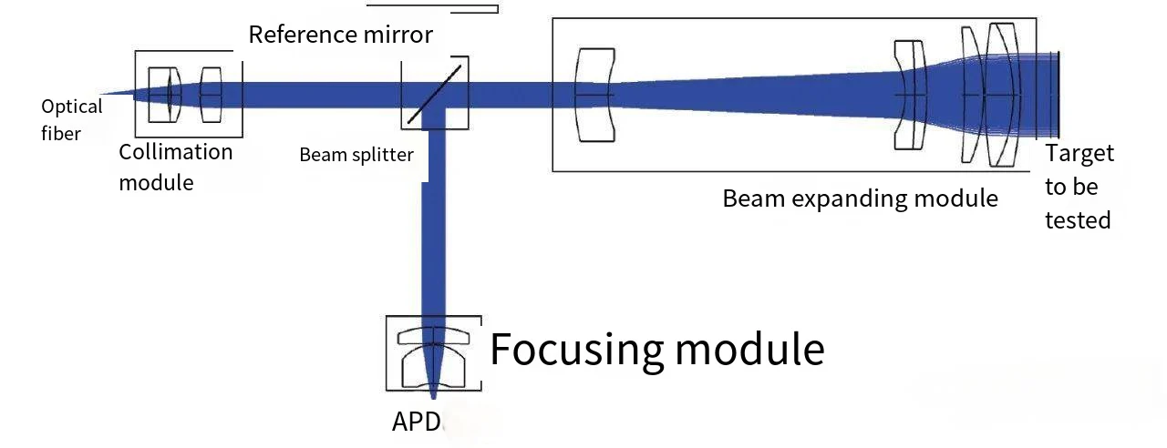 The working principle of the integrated transceiver laser ranging system is shown in Figure 1. The optical part consists of four parts: a collimation module, a beam splitter, a beam expansion module and a focusing module (the lenses in the figure are all model illustrations). The laser signal is emitted from the optical fiber port and is first shaped into a parallel beam by the collimation module, then passes through the beam splitter (BS), amplifies the beam diameter through the beam expander module, and finally irradiates the target surface to be measured. After the laser beam is diffusely reflected on the surface to be measured, part of the echo signal is collected again by the optical system and is received and amplified by the avalanche photodiode (APD). In order to calculate the time interval from laser emission to collection, the system is equipped with a reference mirror, which can compare the difference in collection time between the two pulsed lights and indirectly calculate the relative distance to the target to be measured.